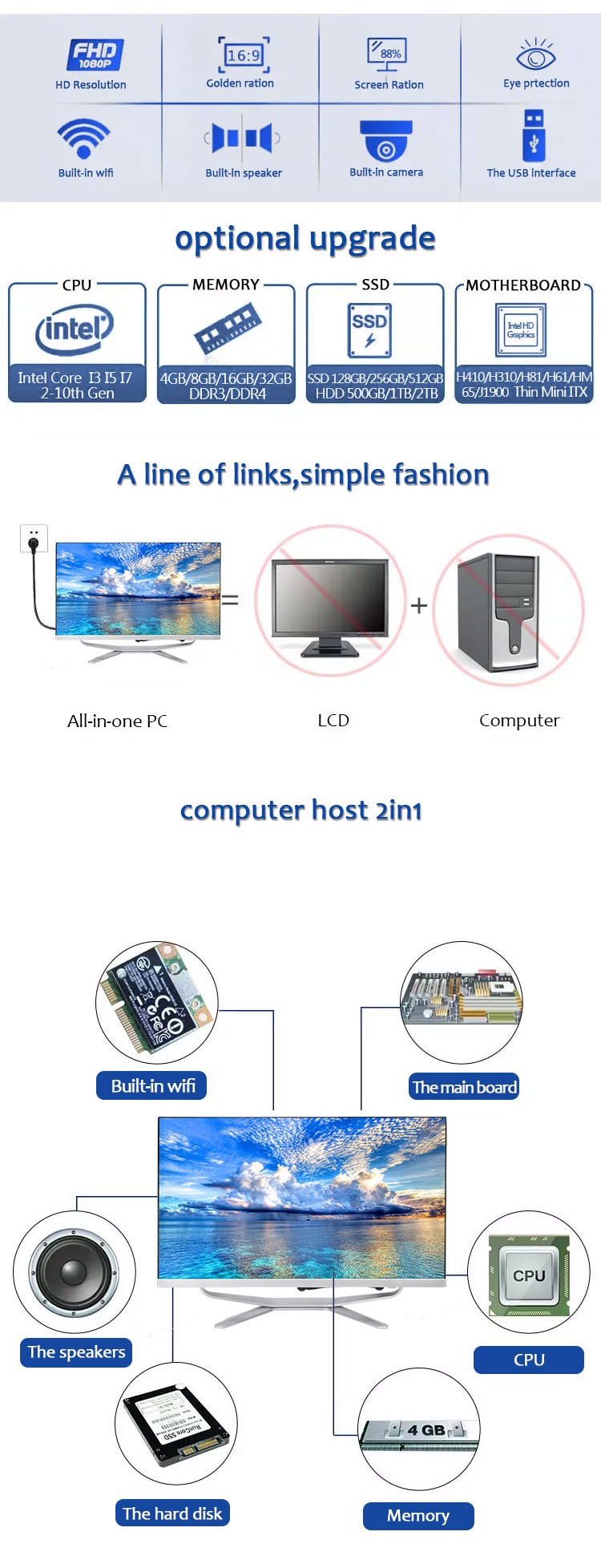 1. Efficient performance: The all-in-one is equipped with the latest processor, providing strong computing power and easy multi-tasking. Whether it is office software or graphic design, it can run smoothly and improve work efficiency.